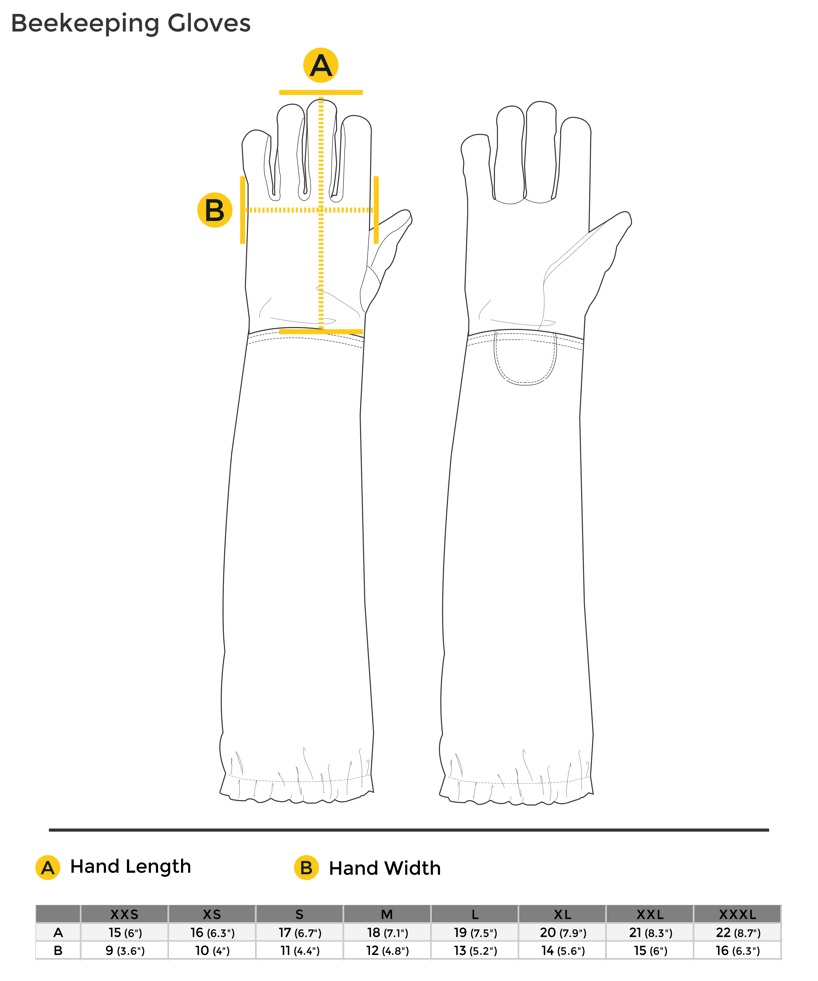 Leather Pigtskin Bee Gloves are available in extra small (childs), small, medium, large, extra large, and extra extra large.